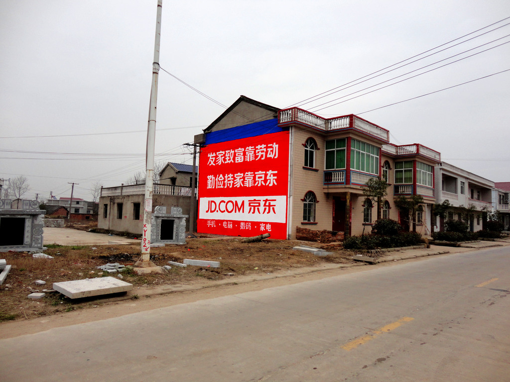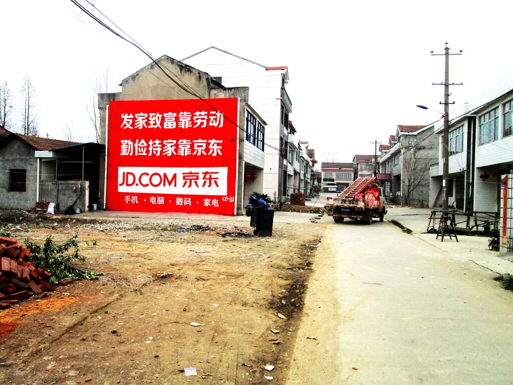 春節(jié)前夕,京東商城真正開始了在湖北、湖南、河南、江西的農(nóng)村戶外墻體彩繪廣告之旅,僅僅不到一個月的施工時間,“發(fā)家致富靠勞動、勤儉持家靠京東”的響亮口號刷偏了十萬平方米的城鎮(zhèn)墻壁,持續(xù)了7個月的戶外農(nóng)村墻體廣告宣傳,使受眾面數(shù)以百萬計,效果直接而明顯。